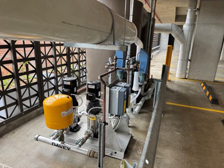 - Dual Variable Speed Pumpset: A tailored Davey Water Products pumpset solution, with each pump capable of delivering 48LPM @ 46M. Specified to provide consistent pressure across multiple green areas of the building, integrated with system safeguards to ensure reliability.