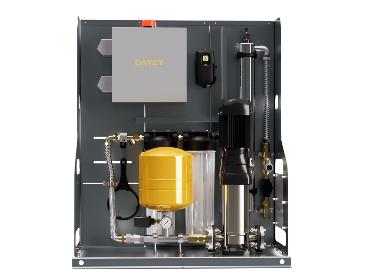 Davey Rainbank PRO is a commercial rainwater / mains water interconnection pump set for flows up to 120 L/min. Specifically designed to source rainwater for high flow applications with seamless switching to mains water for back up and powered by Davey vertical multistage pumps in fixed speed 1 phase or variable speed 3 phase options, the Rainbank Pro is class leading and ideal for rainwater harvesting on metropolitan buildings with large roof areas.